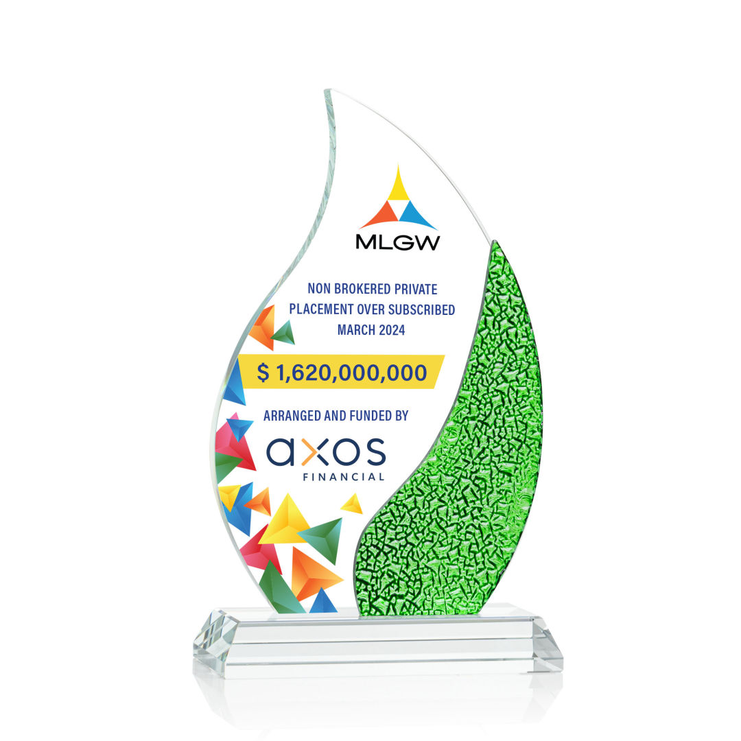 The Oakley Flame VividPrint™ Award is a radiant masterpiece that stands out amongst the crowd! The main body of the award takes the form of a dynamic flame, meticulously sculpted from Starfire Crystal. What sets this award apart is the innovative inclusion of a stained glass-like texture at the side of the award that follows the curved flame shape. This intricate detail adds a layer of complexity and artistry to the design, creating a visual symphony of color and pattern. Mounted on a clear tapered Starfire Crystal base, this unique yet versatile award is suitable for recognizing achievements in any industry! Available in various colors.